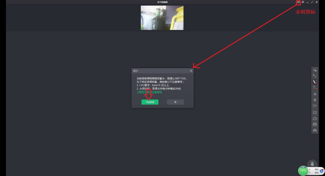 3、进入板书编辑器,点击右上方录制图标,弹出“提示”窗口,点击【开始录制】。