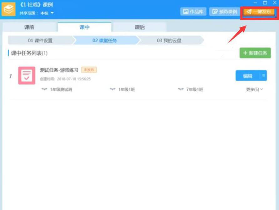 7、接着,在AiClass 中,点击其右上方的“一键发布”按钮,学生端便可收到AiClass游戏练习。