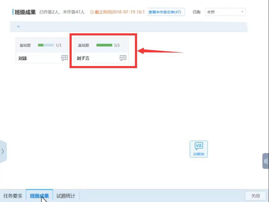 9、当学生点击提交后,老师可以在班级成果中查看已作答和未作答的人数。在已作答的学生列表中,可点击想要查看的学生。