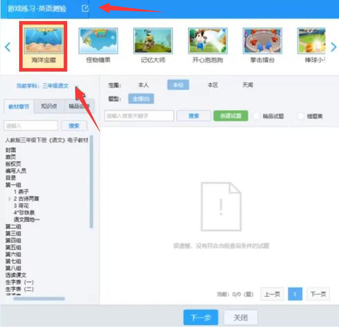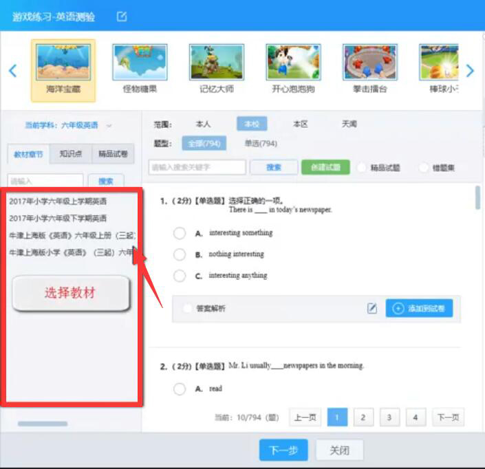 4、接下来,老师从左侧的“教材章节”中选择适合自己的教材;并在右侧选择试题,试题选择完成后,点击“下一步”的按钮。