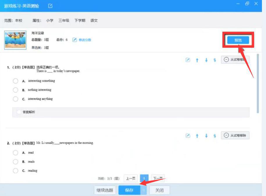 5、完成上一步后,老师就可以在AiClass游戏练习中点击“预览”按钮,从而预览试题效果,确认试题无误,点击“保存”按钮。