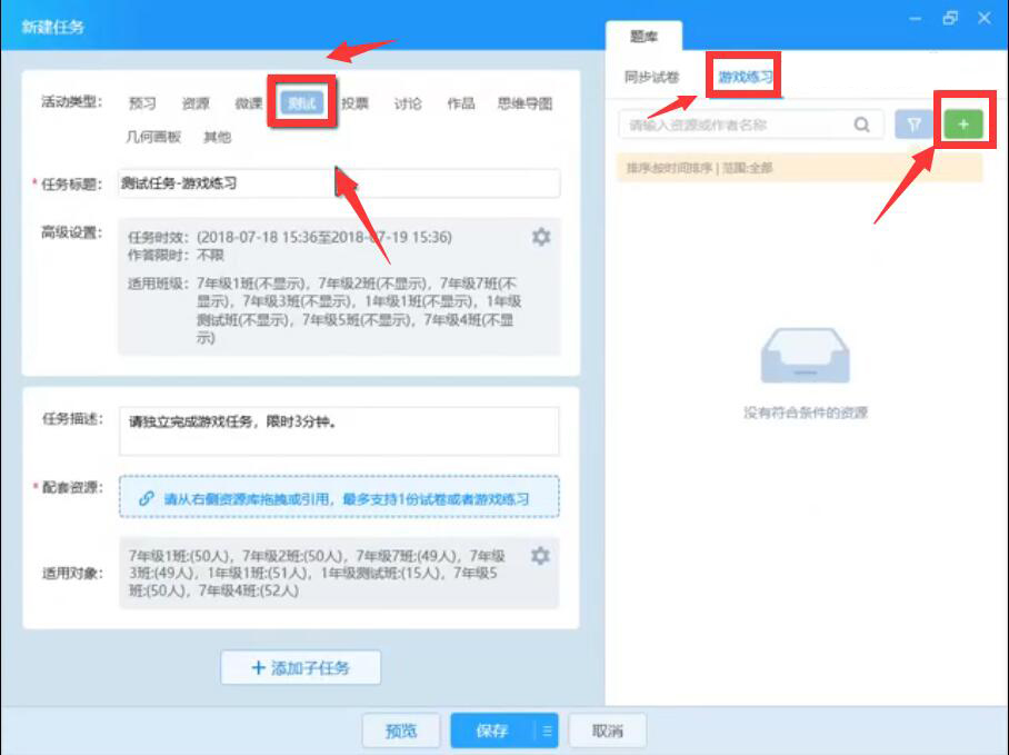 1、首先,在AiClass备课界面中,点击左侧“测试”和右侧的“游戏练习”、“+”,从而新建AiClass游戏练习。