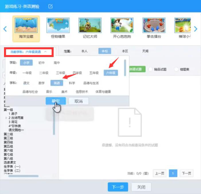 3、AiClass游戏练习的模式确定后,老师要正确选择当前学科、年级、学科,点击“确定”按钮。