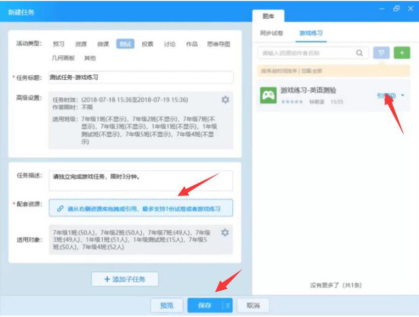 6、此时,老师便可以在AiClass游戏练习中发现自己出的试题资源了。点击引用将它拖放到“配套资源”,再点击下方的“确定”按钮。
