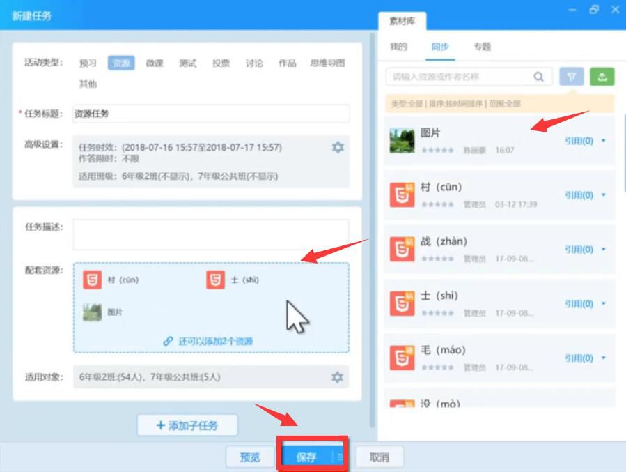 4、接下来,老师回到新建任务的设置界面,将自己刚刚上传完成的AiClass课堂资源拖拽到左侧的“配套资源”中,点击“保存”按钮,从而进入AiClass课堂资源分发的环节。