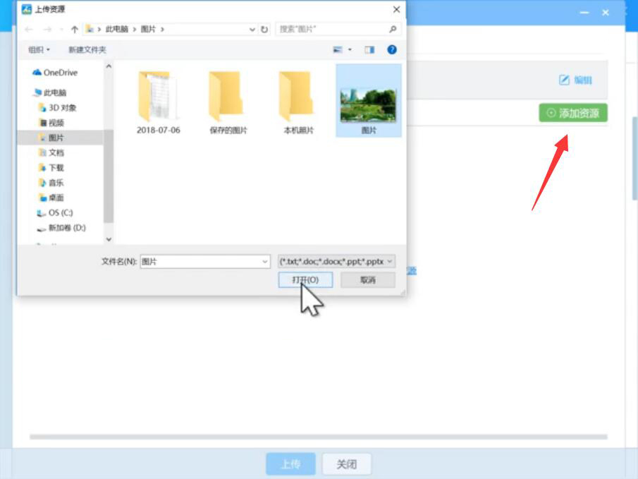 2、然后,在上传资源的界面中,点击“+添加资源”的按钮,单击自己所需要上传的AiClass课堂资源,点击“打开”。