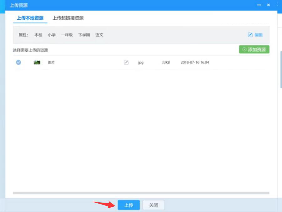3、此时,老师就会发现该AiClass课堂资源已经出现在上传资源的列表中,点击下方的“上传”按钮,便开始执行AiClass课堂资源上传的指令。