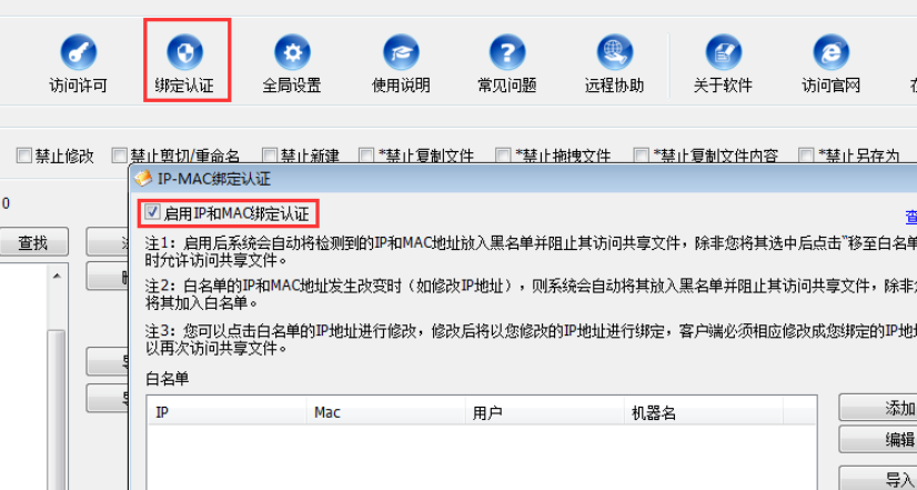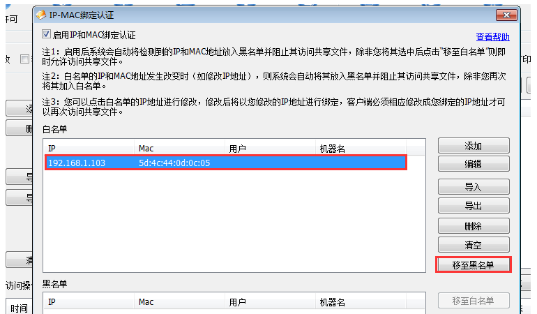 如此一来,其他没有加入白名单的主机就无法访问共享文件夹,如果目前白名单中的某些主机也需要禁止访问,只要将其选中,点击【移至黑名单】,