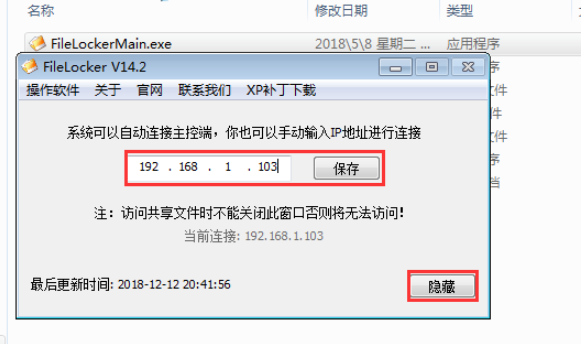 进入主界面,根据提示输入共享文件服务器的IP地址,点击保存,最后点击【隐藏】即可。