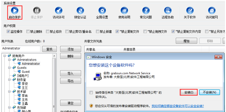 进入软件界面,点击左上角的【启动保护】,弹出Windows安全对话框,点击安装驱动,安装完成,还会弹出一个窗口,点击确定即可,