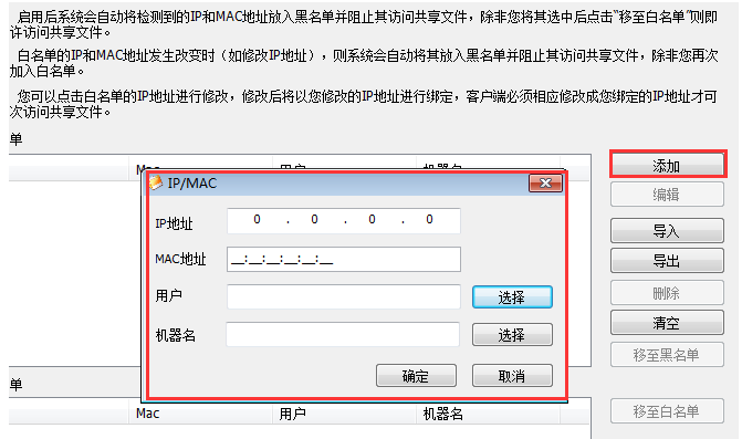 点击添加,如图,根据提示输入允许访问的主机IP和MAC地址,然后点击确定,