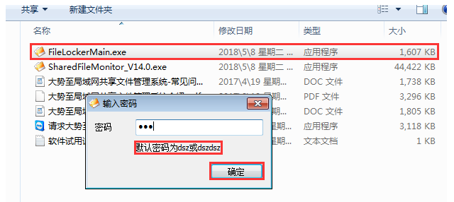 设置完成,将之前解压文件中的客户端FileLockerMain.exe进行安装,安装到每台客户机,安装完成,使用快捷键【Alt+F5】,唤出登录框,输入初始密码dsz,点击确定登录。