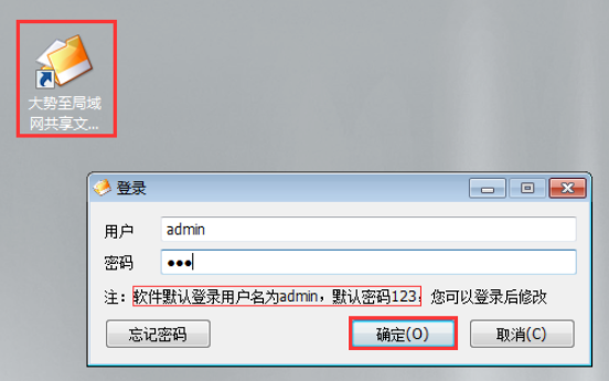 安装完成,在电脑桌面找到其快捷方式,双击打开,弹出窗口,输入初始账号和密码,点击确定,