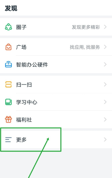 打开手机钉钉,进入界面,登录账号,点击右下角【发现】,如图,选择【更多】,