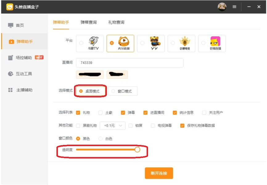 1)桌面模式特点是比较灵活,进入直播间后,直播盒子根据选择列表拆分为若干模块,主播可以根据个人习惯来调整每个模块的位置、显示关闭和透明度。