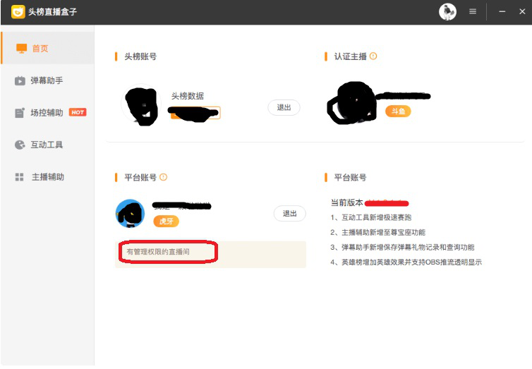 3、成功登录直播账号后,头榜直播盒子会显示登录账号名称和管理权限。