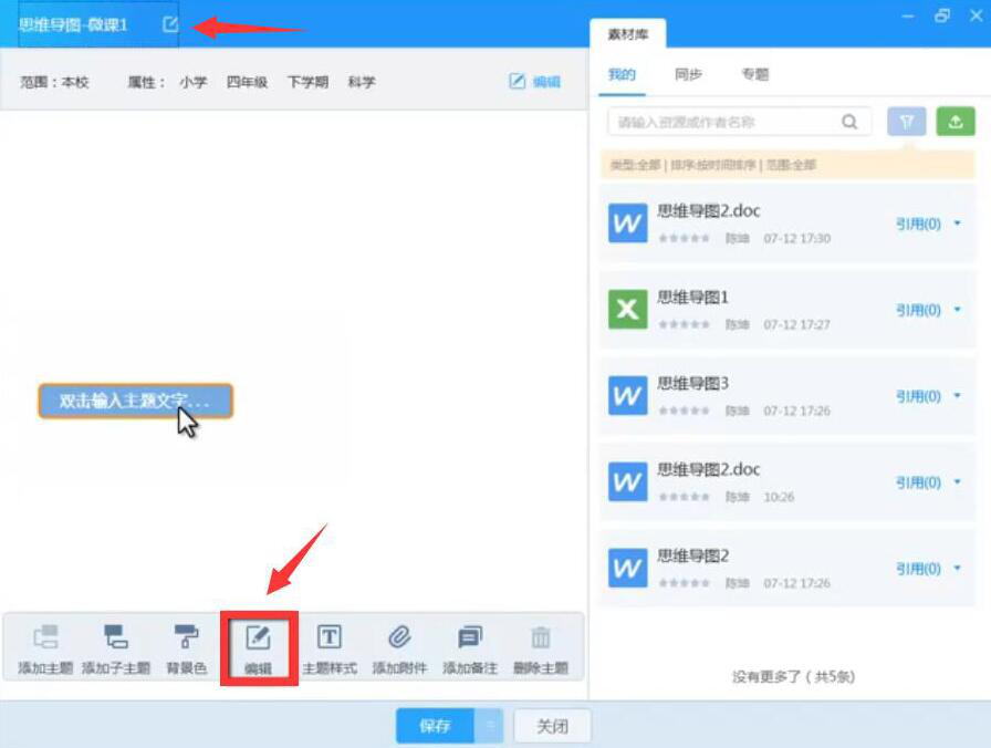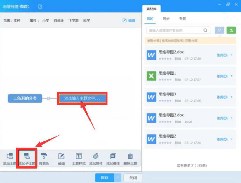 4、此外,老师可以点击工具栏中的“添加附件”、“添加备注”来对某个主题加以进一步的说明,也可以点击“主题样式”来美化主题,之后,点击“保存”按钮。