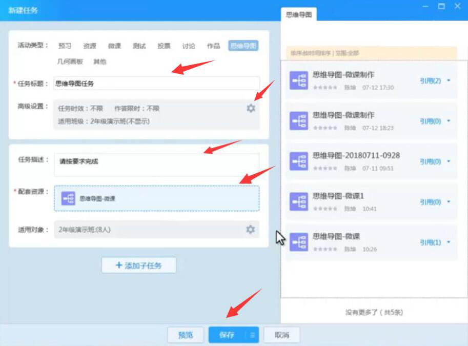 5、接下来,回到AiClass思维导图设置界面,老师填写任务标题、设置任务时效、学生作答限时、适用班级、任务描述、适用对象,并在右侧思维导图资源中,将该思维导图拖拽到左侧“配套资源”中,点击“保存”按钮。