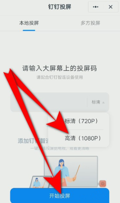 你可以选择视频清晰度,这里选择高清,然后点击【开始投屏】,发起钉钉群直播功能,即可将直播内容投屏到电视。