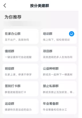 如图,这里有各种群聊类型,点击【禁止私聊群】,创建群聊,群成员无法在群里点击对方头像进行私聊或者加好友。