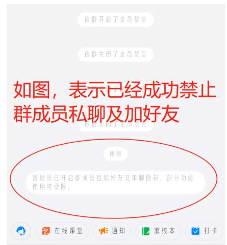 打开群管理功能,如图,下拉找到【禁止群成员私聊】选项,将其启用,即可禁止群成员私聊,群成员之间也不能互加好友。