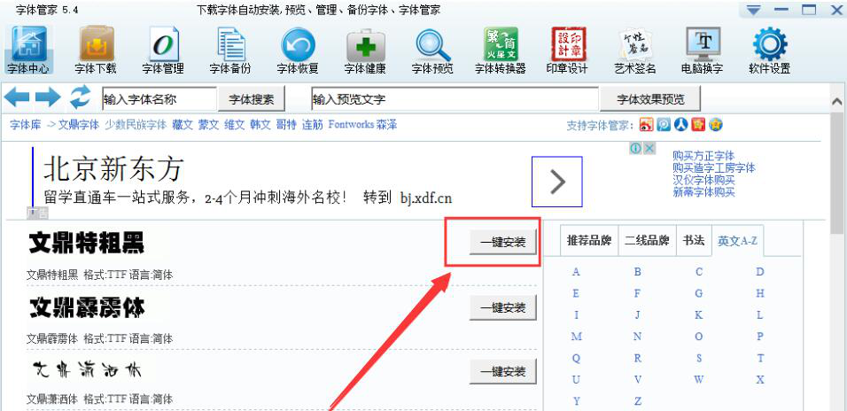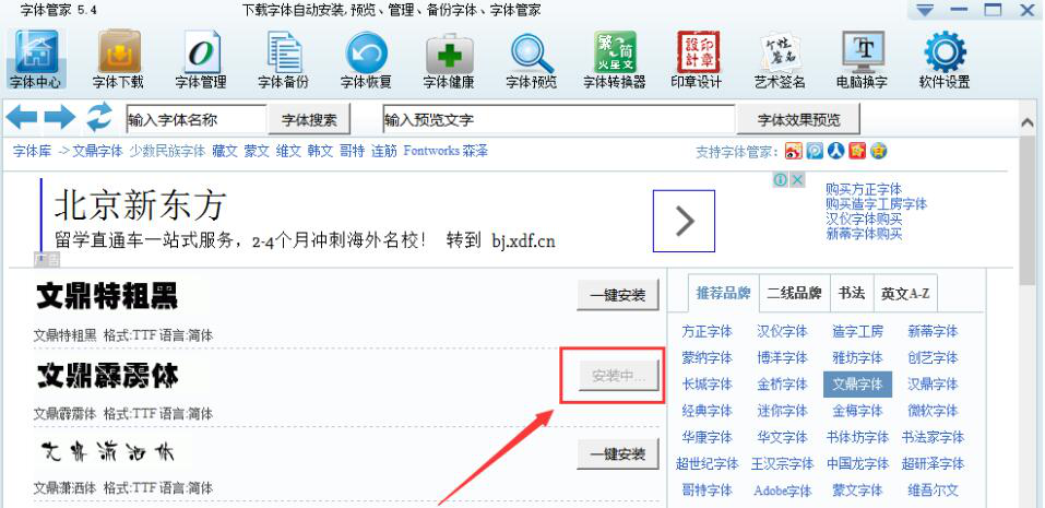 3、然后,字体管家便会出现如下图的字体安装界面,用户在自己需要使用的字体处,点击其右侧的“一键安装”按钮。