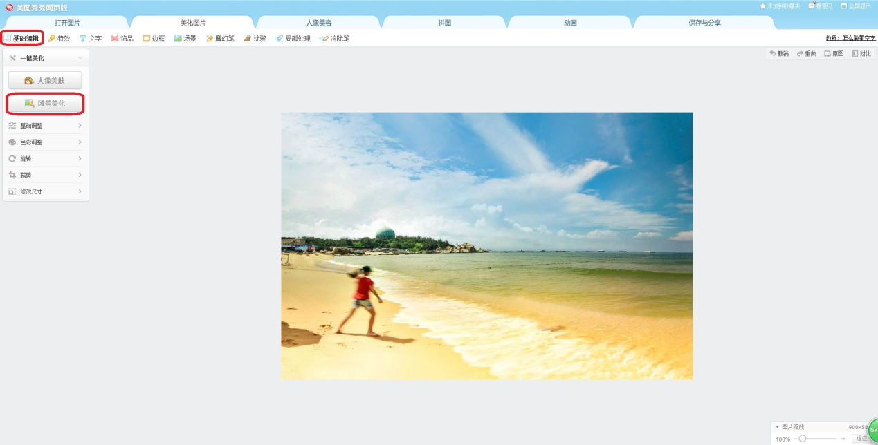 5、点击左上角【基础编辑】,在一键美化中选择点击【风景美化】。