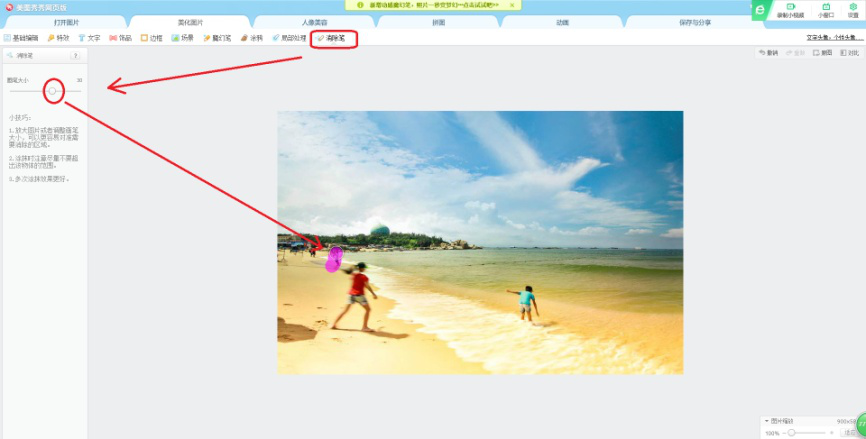 2、点击【美化图片】,在上面工具栏中选择【消除笔】。