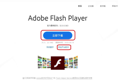 2、自动打开Adobe Flash Player下载界面,系统自动为用户匹配了合适的版本,只需点击【立即下载】。如果用户有其他要求,也可以点击【其他平台下载】,设置需要的版本。