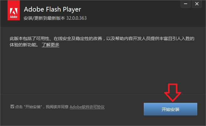 3、自动下载Adobe Flash Player,下载完成后弹出安装窗口,如图,点击【开始安装】。