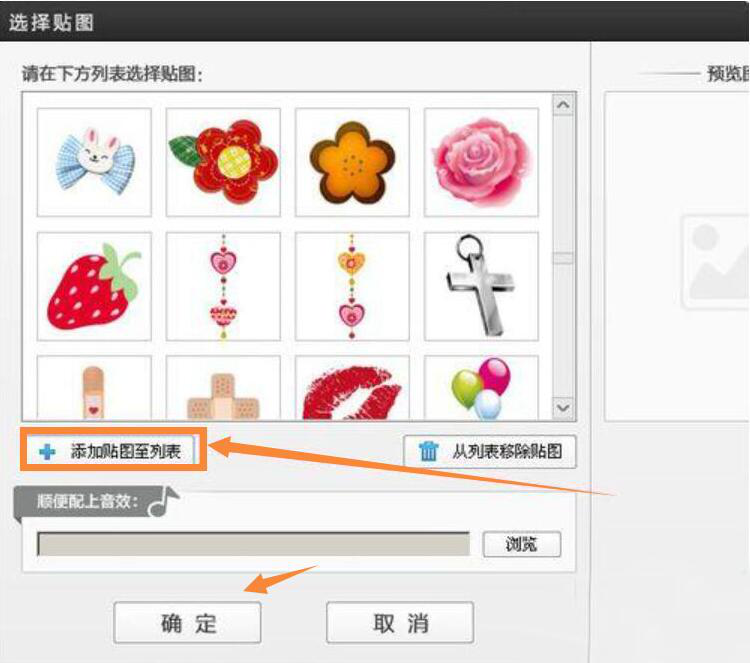 5、接着,双击该时间位置,便会弹出如下图的爱剪辑“选择贴图”操作界面。用户在此界面中,点击“+添加贴图至列表”的按钮将需要添加的照片给导入进来,之后点击下方的“确定”按钮。爱剪辑便开始执行在视频中添加照片的指令了。