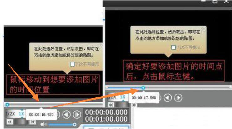 4、接下来,用户需要在视频的时间轴上选择需要添加照片的时间点。并将鼠标移至视频预览窗口下方的时间轴找到相应的时间位置,单击确定该位置。