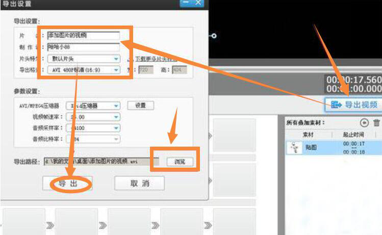 6、最后,在爱剪辑的“导出设置”界面中,用户对导出路径、导出的格式等等进行相关的设置后,点击“导出”按钮。爱剪辑在视频中添加照片的操作即完成。