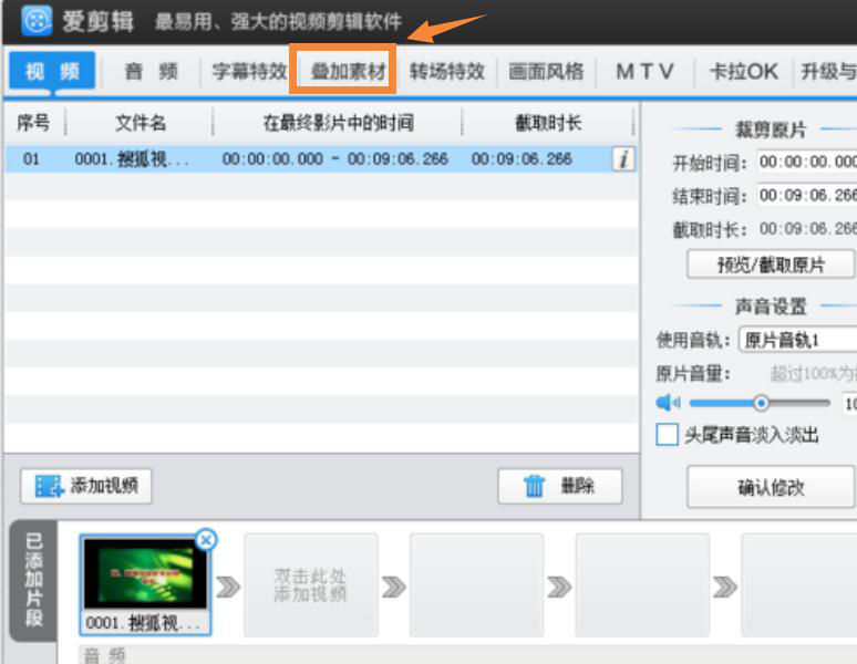2、然后,在爱剪辑主界面中点击“叠加素材”,继续下一步的操作。