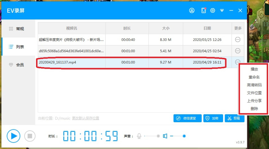 9、视频录制完成后,EV录屏会自动转到列表,在这里显示刚刚录制的视频,点击该视频右侧更多图标,在下拉菜单中可对视频进行播放、重命名、转码、上传等操作。
