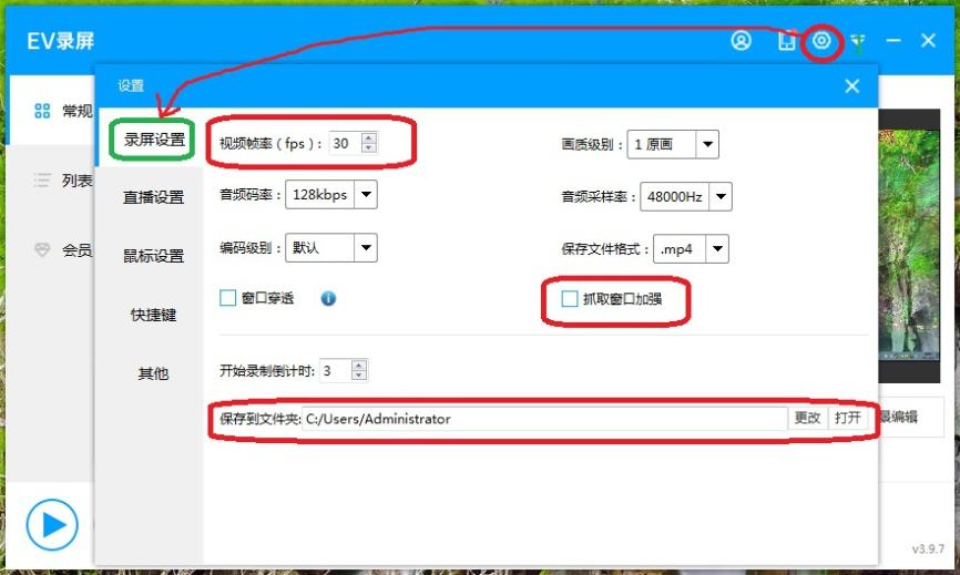 5、点击右上方齿轮,打开设置窗口,在【录屏设置】中将“视频帧率(fps)”设置为【30】以上,勾选“抓取窗口加强”,然后点击【更改】将录制视频的保存位置设置在非系统盘上。