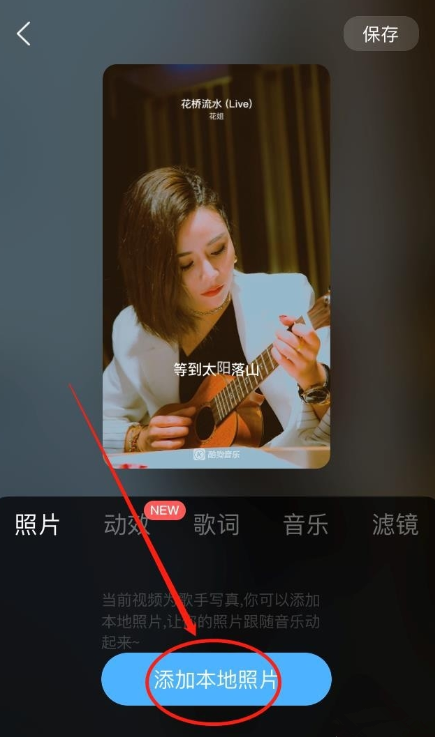 照片添加完成,你可以点击【编辑】,进行相关设置,还可以添加动效、滤镜等,最后点击【保存】,即可制作酷狗音乐影集,