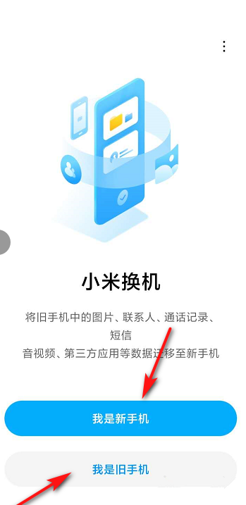 小米换机功能支持将旧手机中的图片、联系人、通话记录、短信、音视频等数据迁移至新手机,如图,根据实际情况来选择新旧手机,