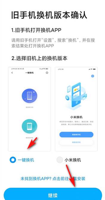 选择旧设备,进入以下页面,查看相关提示,在新手机中确认旧手机换机版本,点击【一键换机/小米换机】,点击继续按钮,