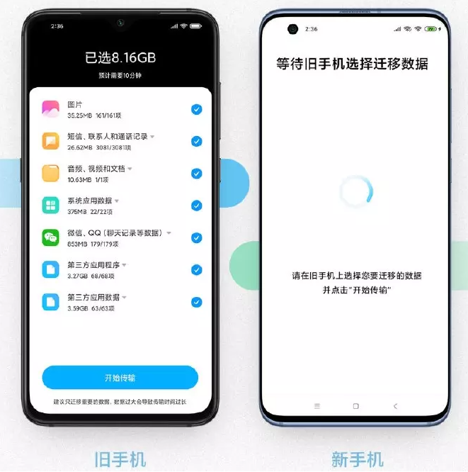 现在打开旧手机,启用小米换机功能,找到并连接新手机显示的热点名称,选择需要迁移的数据,点击【开始传输】,即可进行数据迁移。