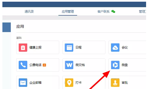 进入应用管理页面,点击【微盘】,进行微盘管理,点击【限制成员使用量】,