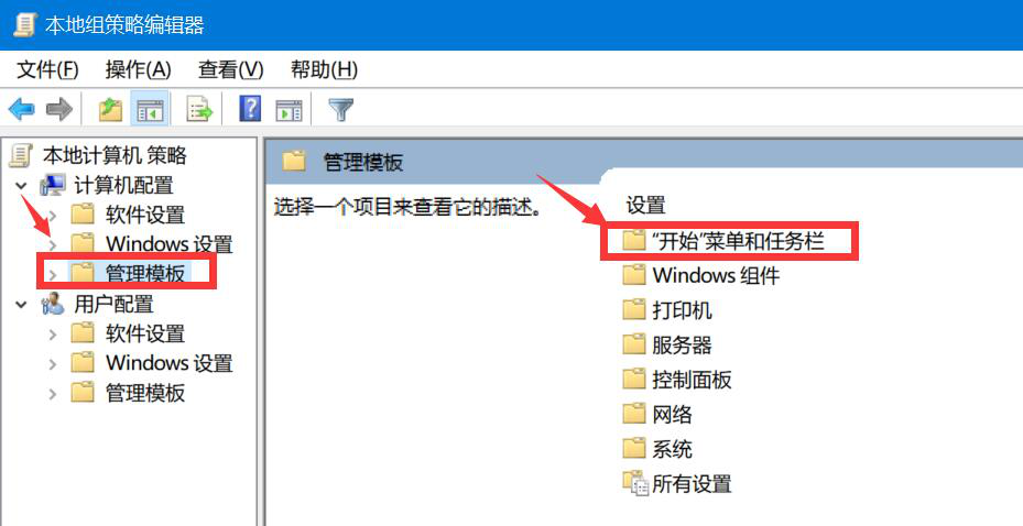 5、在本地组策略编辑器界面中,双击“管理模板”和“开始菜单和任务栏”。