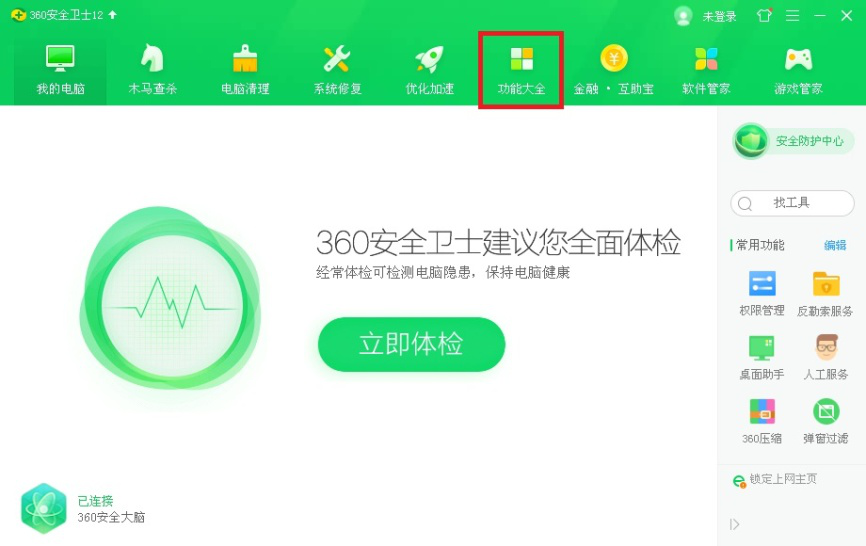1、打开360安全卫士,点击上方【功能大全】选项。