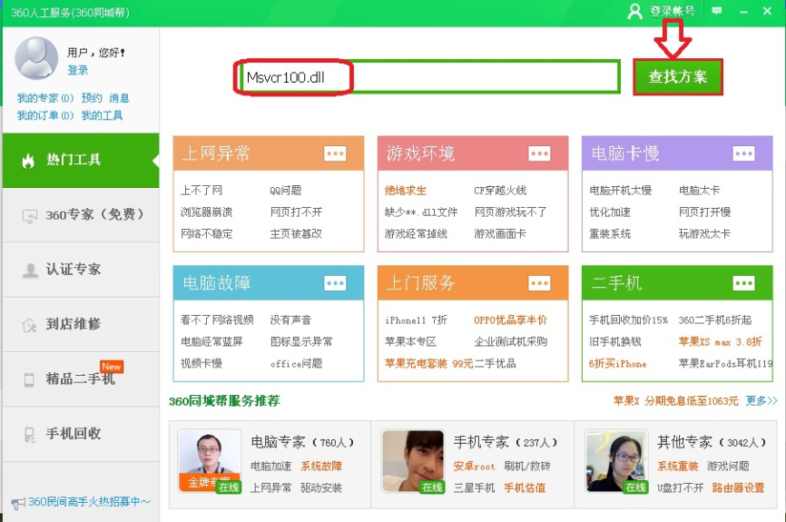 3、在人工服务界面上方的搜索栏文本框内输入“Msvcr100.dll”,点击【查找方案】。
