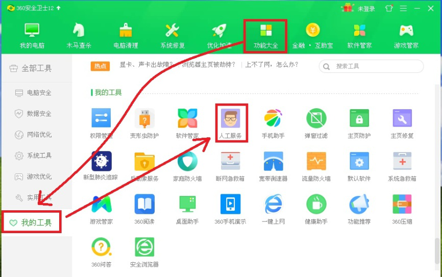2、点击功能大全左侧【我的工具】选项,在右侧列表中找到并点击【人工服务】。