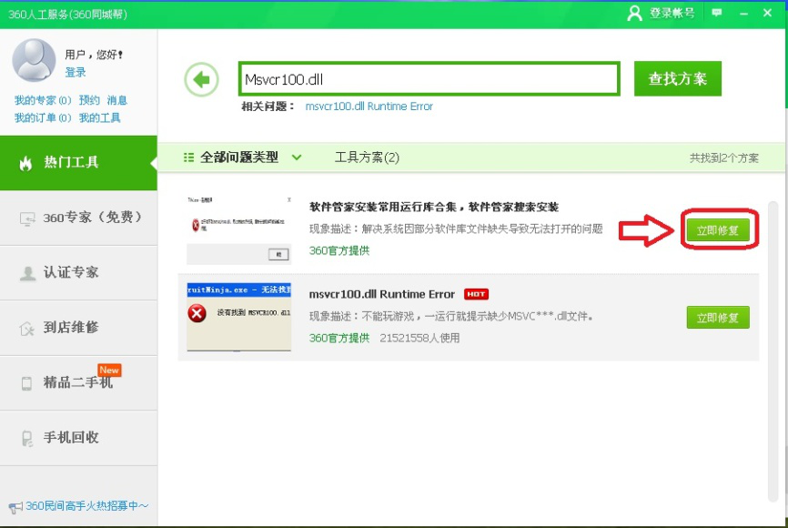 4、在下方列表中找到关于“Msvcr100.dll丢失”的解决方案,点击【立即修复】。
