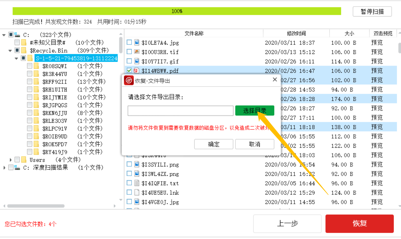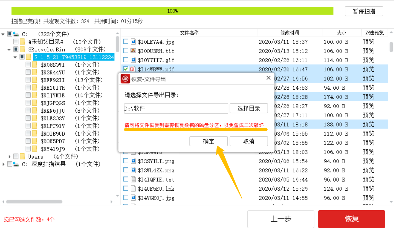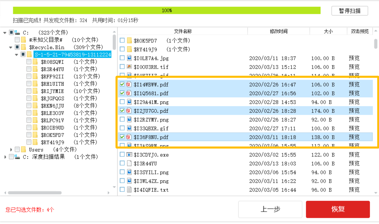 软件会对电脑进行扫描,界面上方会有进度条,无需等待扫描完成,直接在左侧点击查找需要恢复的文件,然后进行勾选,点击【恢复】,