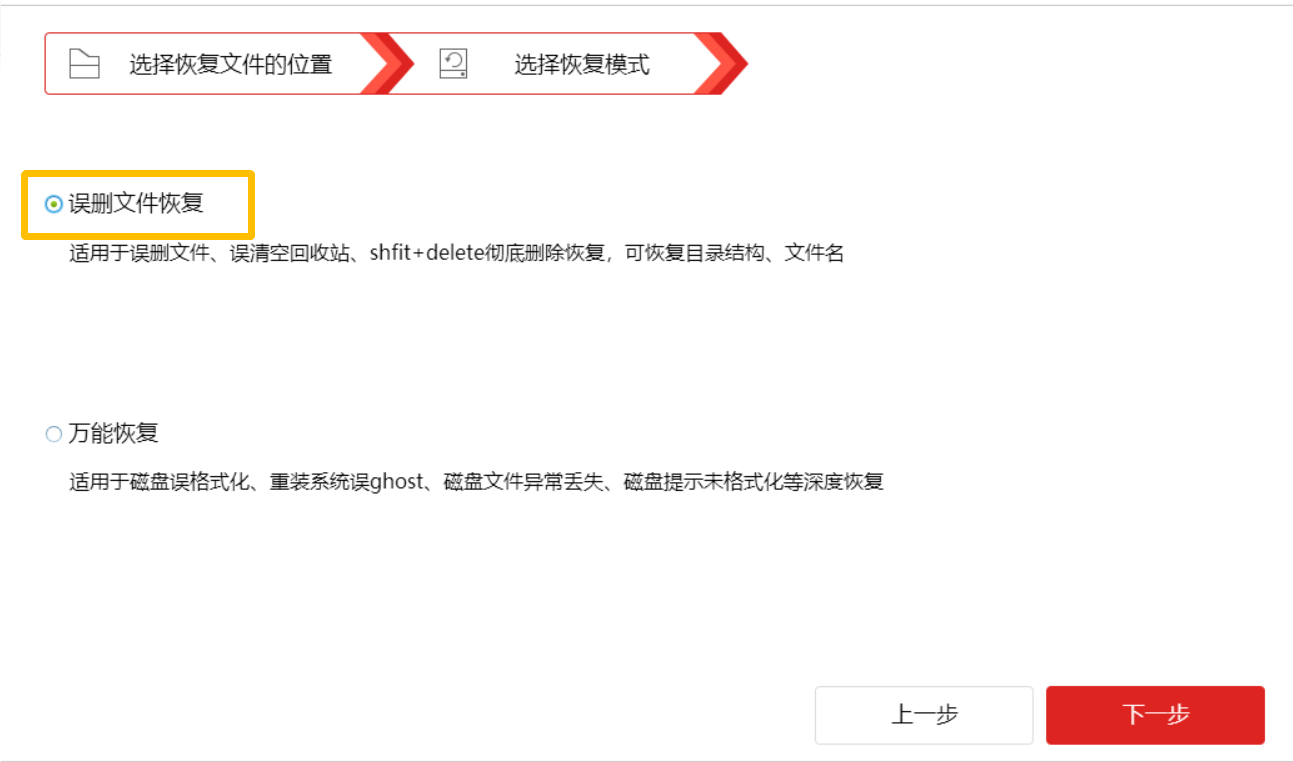 然后选择恢复模式,勾选【误删文件恢复】,点击下一步,