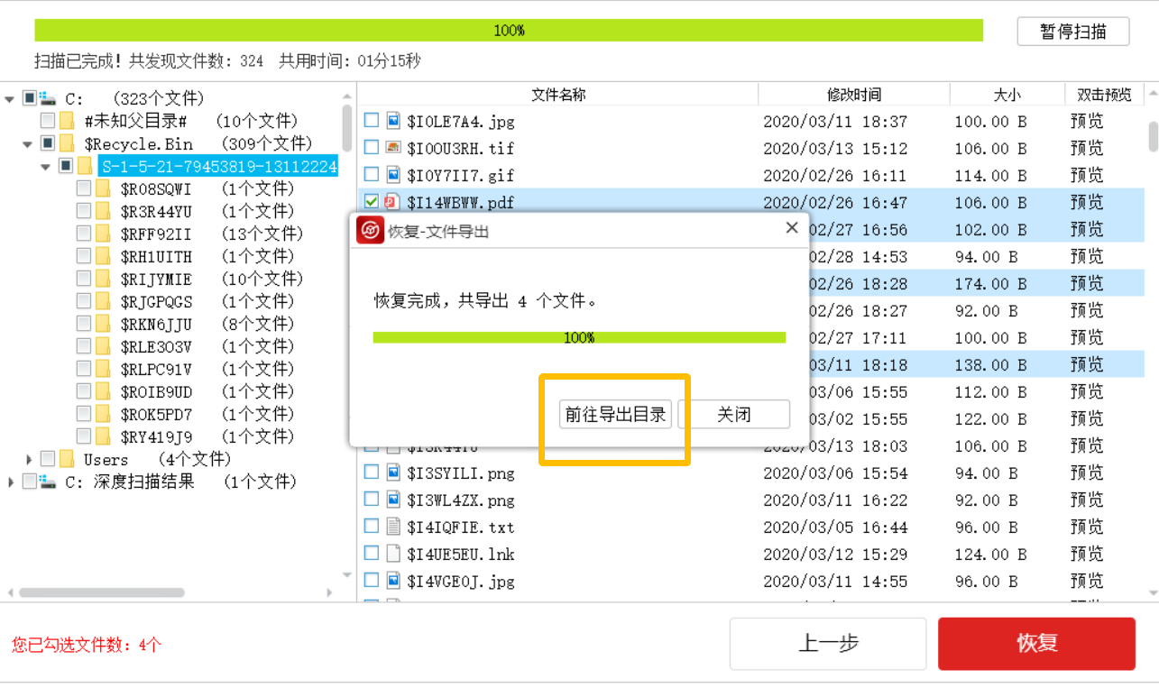 数据导出成功,出现提示,点击【前往导出目录】,即可看到刚才成功恢复的文件。
