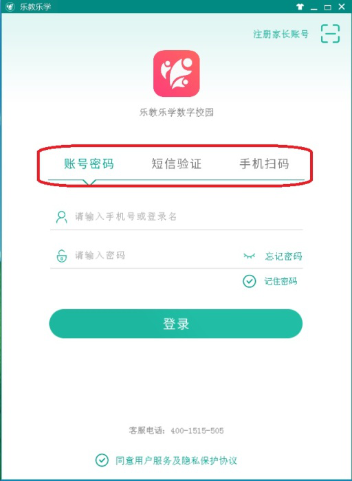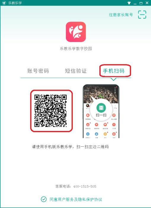打开乐教乐学软件进入登录界面。输入账号+密码或手机号+短信验证码登录,也可以用手机端乐教乐学APP扫码登录。